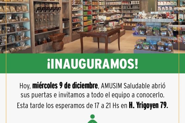 El miércoles 9 de Diciembre AMUSIM inauguró su tienda AMUSIM SALUDABLE en Hipólito Yrigoyen 79 – Santa Rosa- La Pampa. En la misma se podrá comprar alimentos saludables colaborando con la planificación de una mejor calidad de vida